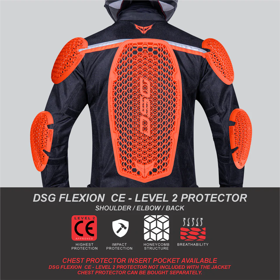 Equipped with DSG FLEXION CE Level 2 protectors on the back, shoulders, and elbows, the DSG Roadster Jacket offers unrivalled protection against impacts. For additional peace of mind, chest protectors are available separately to further bolster your safety.